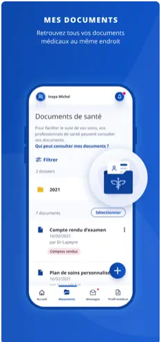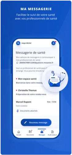 • Messagerie de Santé : Communication SécuriséeL’application comprend une fonctionnalité de messagerie de santé, permettant aux utilisateurs de recevoir des informations et des documents de leurs professionnels de santé en toute confidentialité. Cette communication sécurisée facilite le suivi des recommandations médicales, des résultats de tests et des conseils personnalisés, renforçant ainsi le lien entre les patients et les professionnels de santé.